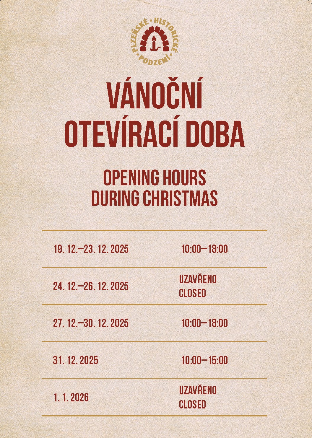 Od 5. do 30. ledna 2026 bude Plzeňské historické podzemí z důvodu pravidelné údržby UZAVŘENO. V tomto období neprobíhají žádné prohlídky. Budeme se na vás opět těšit v únoru 2026.