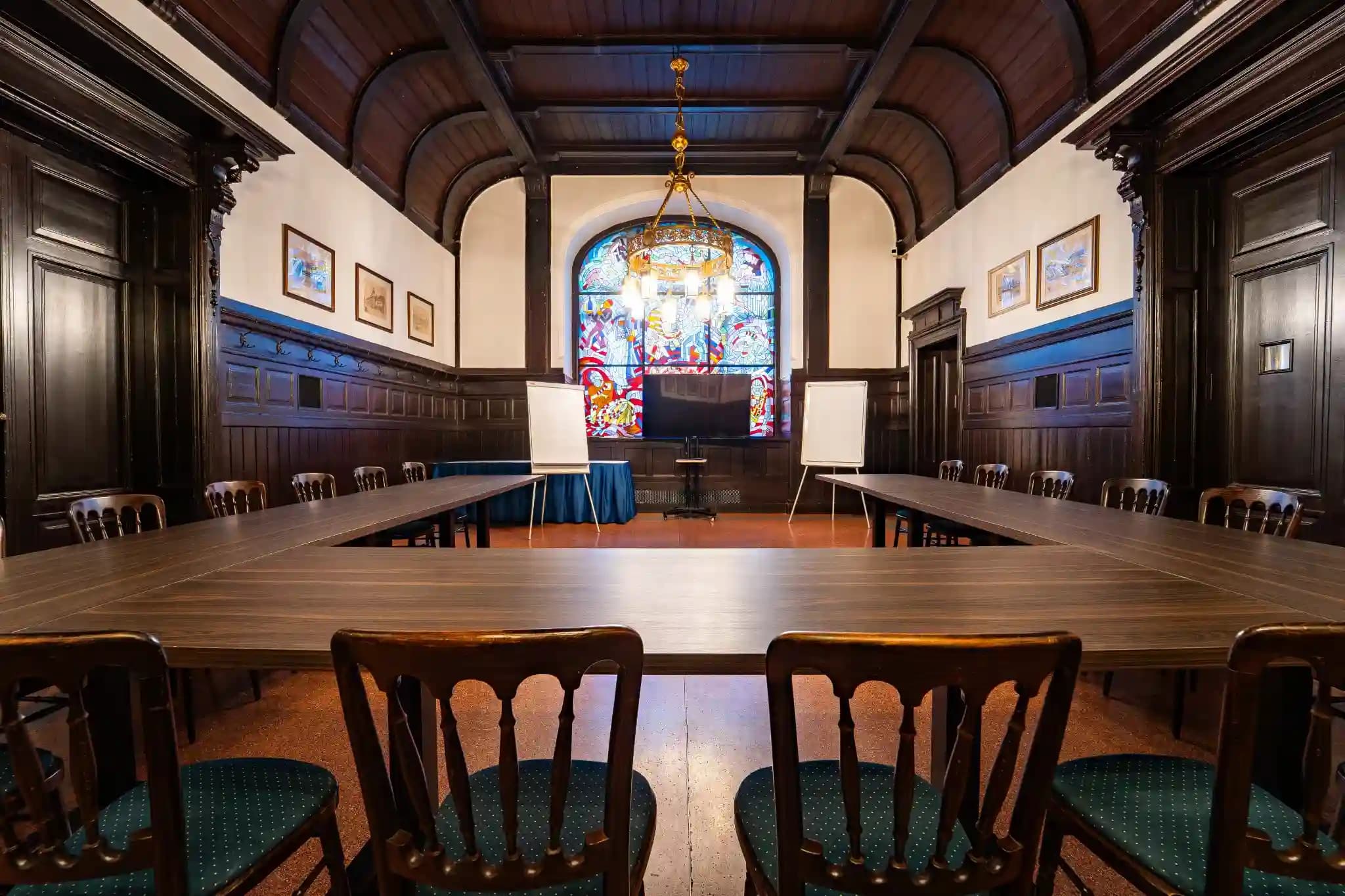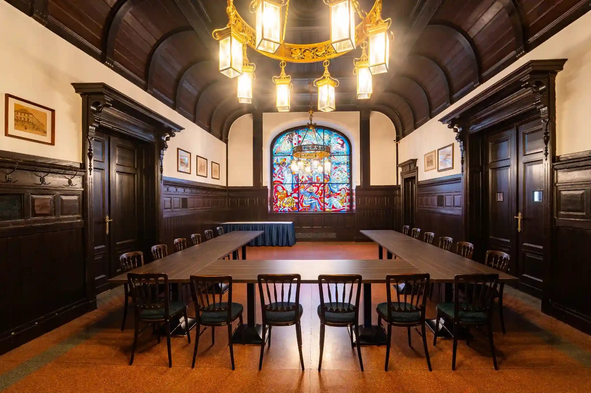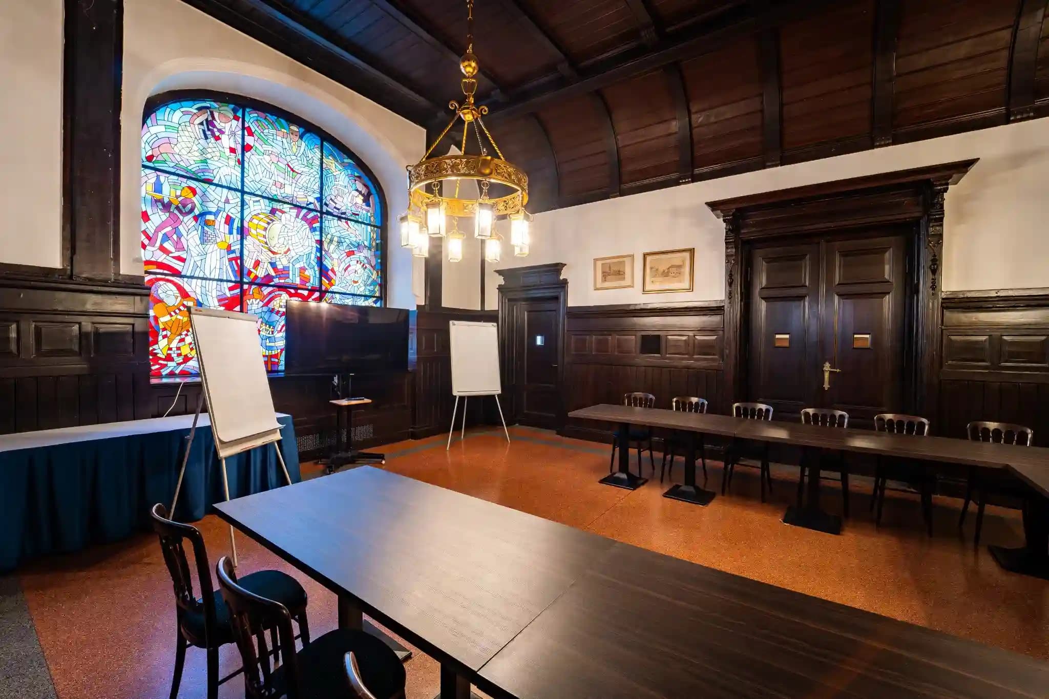 Are you looking for a unique space with an unforgettable atmosphere that has preserved its character while meeting the high standards of a modern event and conference center? The Red Lounge, with its charming stained-glass window, radiates history and is perfect for festive lunches and celebrations as well as presentations and seminars.